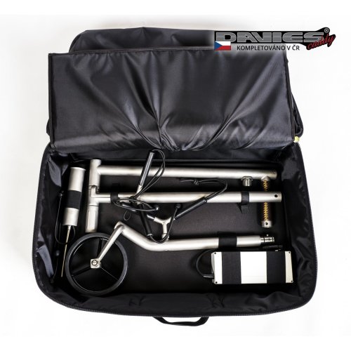 Přepravní kufr je optimalizován pro minimální přepravní rozměry složeného vozíku, všechny části vozíku jsou odděleny přepravními kapsami, nebo upevňovacími suchými zipy.