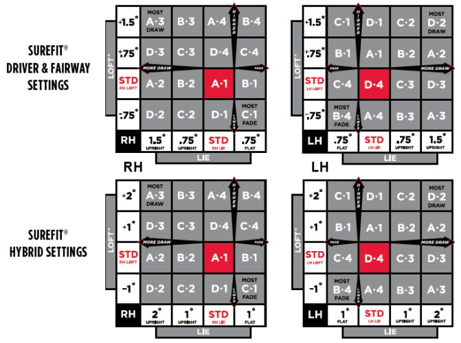 SureFit Adjustibility - nastavitelnost driveru - SureFit umožňuje doladit nastaveni driveru podle potřeb každého hráče pro dosažení maximálního výkonu hole. Bližší popis k nastavení v obrázcích.