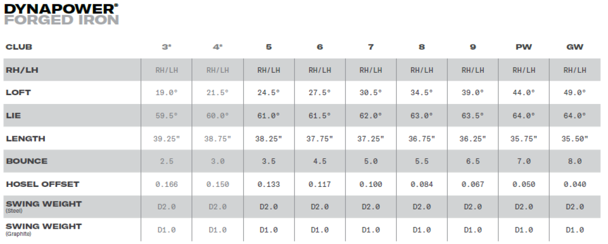 Železa Dynapower Forged se vyznačují konstrukcí hlavy s vysokým MOI pro stabilitu při úderech mimo střed a nízkým těžištěm, které podporuje vyšší launch a strmější dopad.